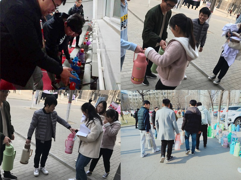 此次女生节活动主要由“你的热水我来提”和“观影游戏活动”两部分组成,此次活动得到了同学们的积极响应,女生节当天,学院各班男生在班长和心理委员的带领下,不辞辛苦地将班级女同学水瓶一个一个接满水又配送到各班级女生宿舍楼下,在寒冷的季节里给女同学们送去一丝温暖。